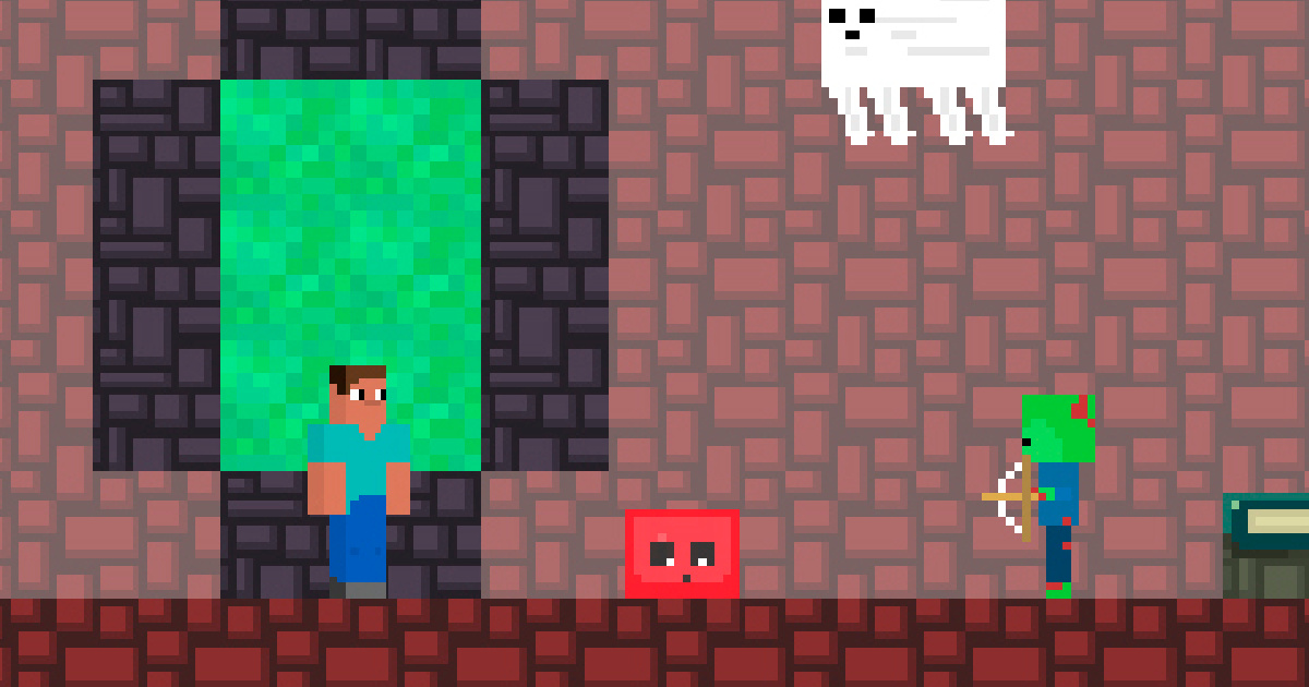 You need to assist the adorable Steven in traversing the portal and arriving at the emerald chest in the crimson darkness. Hurry up, what are you hesitating for? Lend a hand to help Steve access the ballot box. Exercise caution now; additional perilous flying creatures, slimes moving along the surface, and zombies firing arrows are prepared for you.