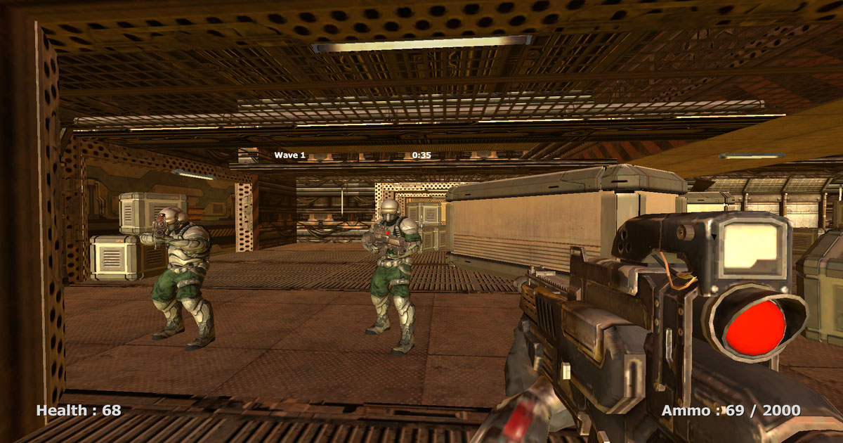 You are an elite space soldier, and your objective is to penetrate the Martian biological weapon research center and utilize your formidable assault rifle to eliminate numerous security personnel. Aim to prevent your weapon from overheating in order to maintain precision and endure all onslaughts of adversaries.